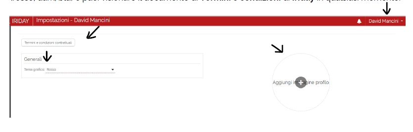 In questa sezione puoi inserire una immagine di profilo, puoi cambiare il Tema grafico del software (rosso, dark, blu) e puoi visionare il documento di Termini e condizioni di Iriday in qualsiasi momento.