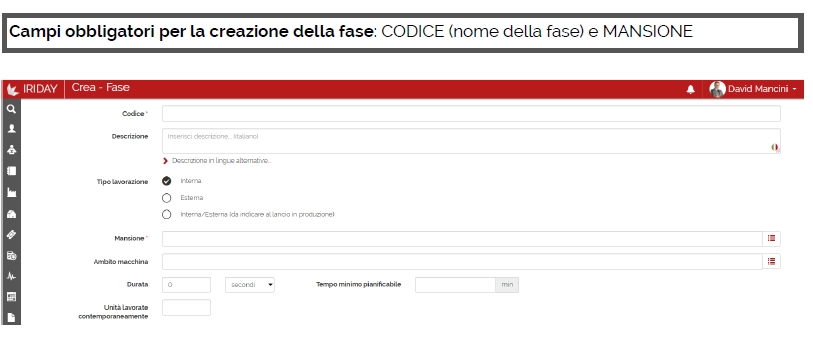 Campi obbligatori per la creazione della fase: CODICE (nome della fase) e MANSIONE.
