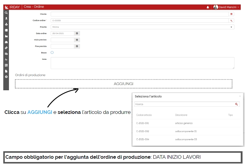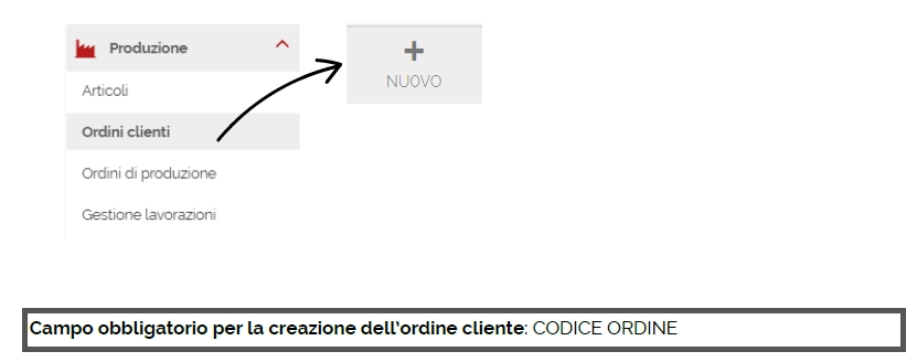 Campo obbligatorio per la creazione dell’ordine cliente: CODICE ORDINE.
