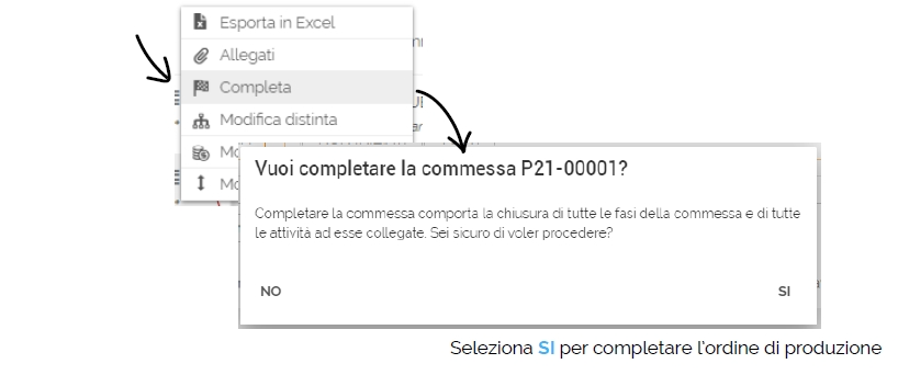 Per completare un ordine di produzione clicca sull’icona dei tre puntini di una voce nell’elenco ordini, poi seleziona “