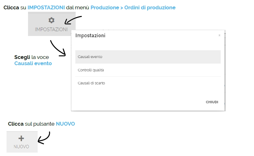Clicca su IMPOSTAZIONI dal menù Produzione > Ordini di produzione.