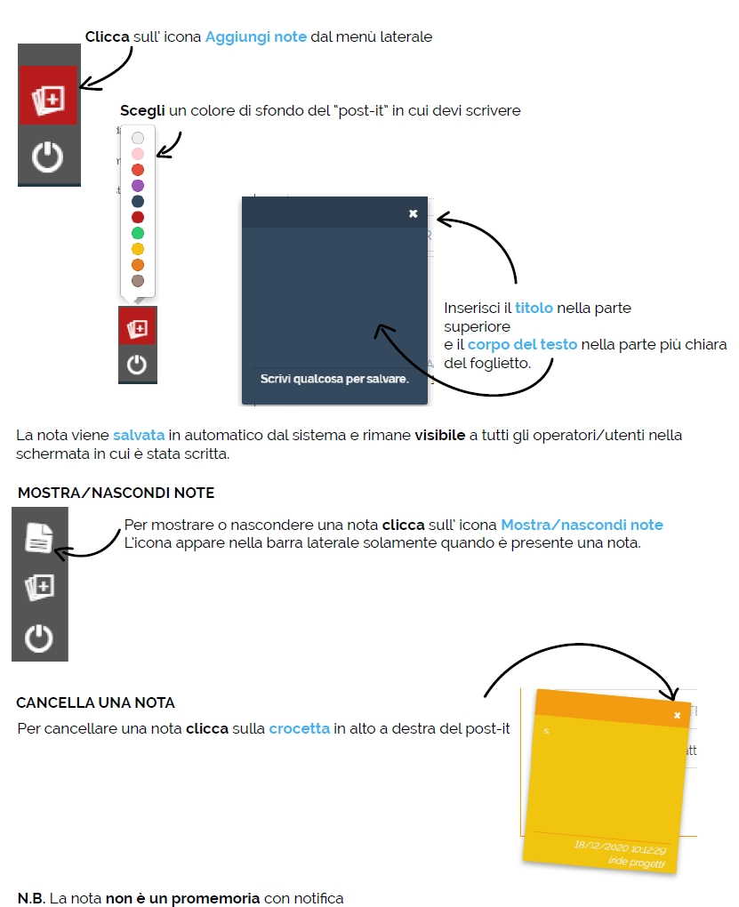 Con questa funzione puoi inserire delle note, in stile “post-it”, associate alle singole schermate del software; non tutte le schermate del software hanno la possiblità di inserire le note.