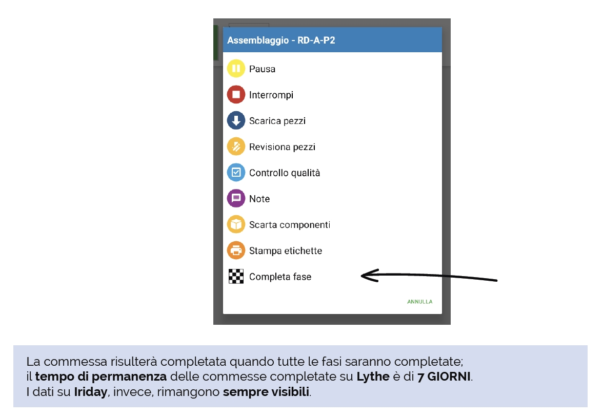 Per completare una fase, clicca sull’icona di stato della fase e scegli