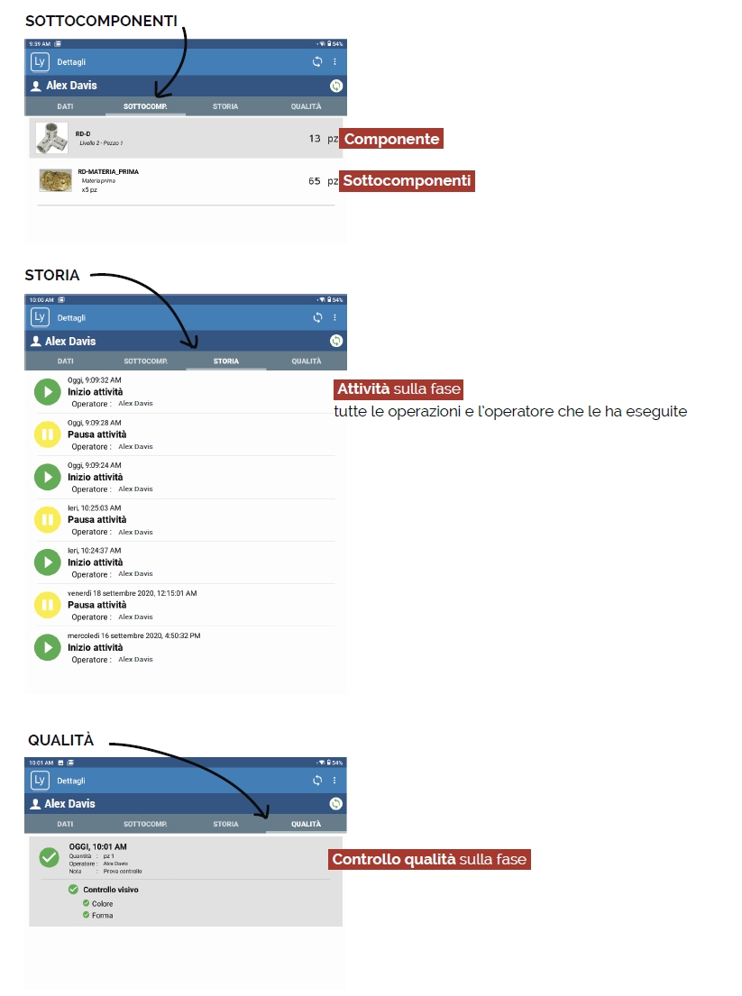 In questa sezione puoi visionare DATI, SOTTOCOMPONENTI, STORIA della fase, controlli QUALITÀ ed inserire allegati.